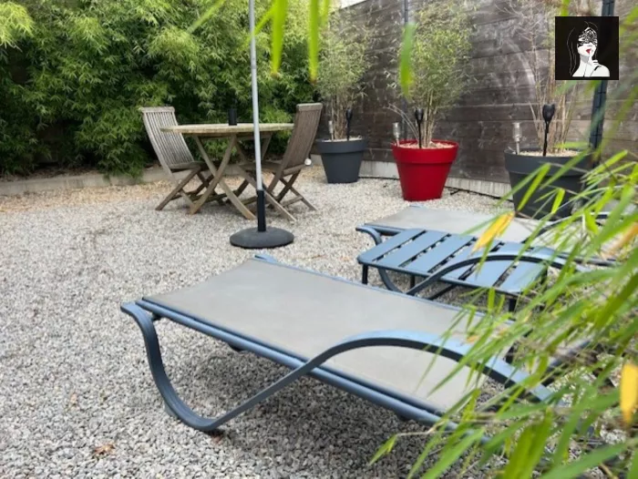 Au centre de la cour, on trouve des chaises longues confortables où les amoureux peuvent se reposer et profiter du soleil. Une table en bois est également installée, parfaite pour partager un repas en plein air.